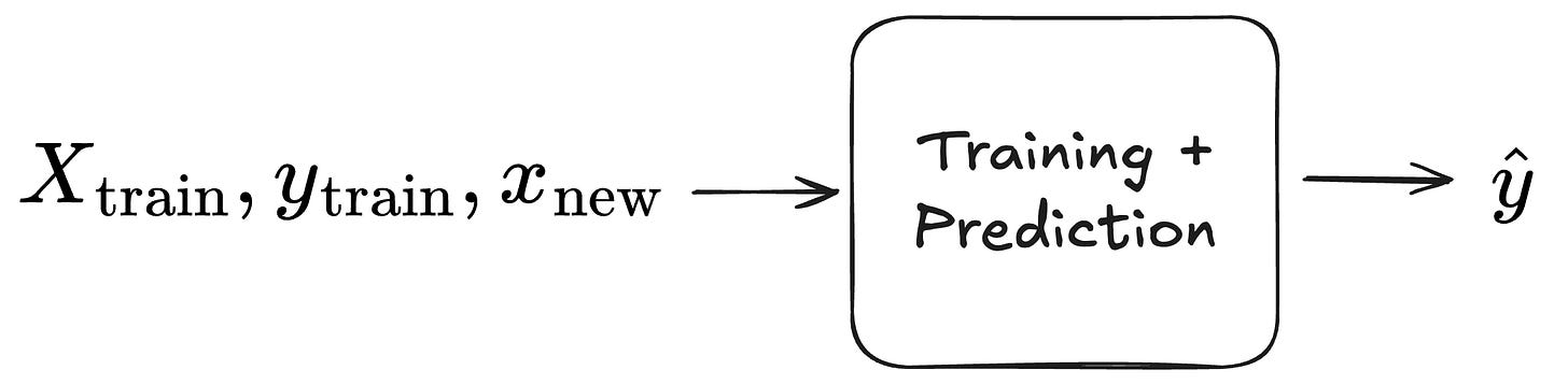 The first step towards a setup where we pre-train and move from train-then-predict to in-context learning is to conceptually wrap training and prediction into one function. This function accepts the triplet of training features, training labels, and the new data point and outputs the prediction. This is even something we could achieve with traditional ML approaches: Technically, we could wrap, say, both training and prediction of a random forest into the same function call.