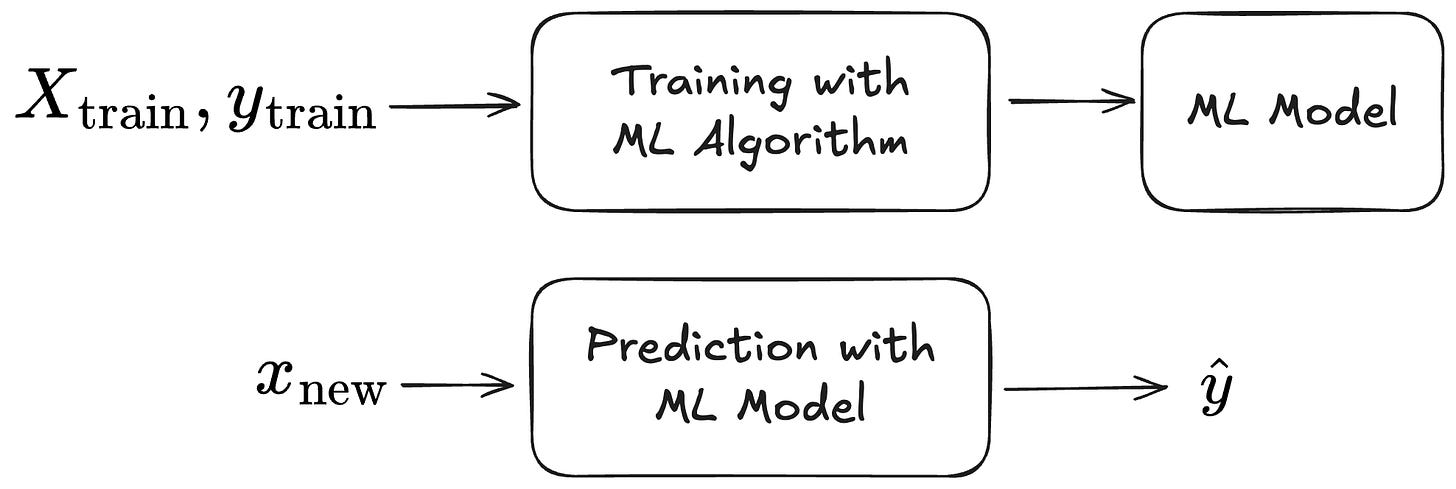 Let’s meditate on the basic thing that supervised machine learning helps us get. The setting: We want to predict an unknown target y from a feature vector x. Fortunately, we also have a labelled dataset from which we may learn a prediction function. This brings us the classic supervised ML setup: an ML algorithm produces an ML model from the training data; the model makes predictions for new data.